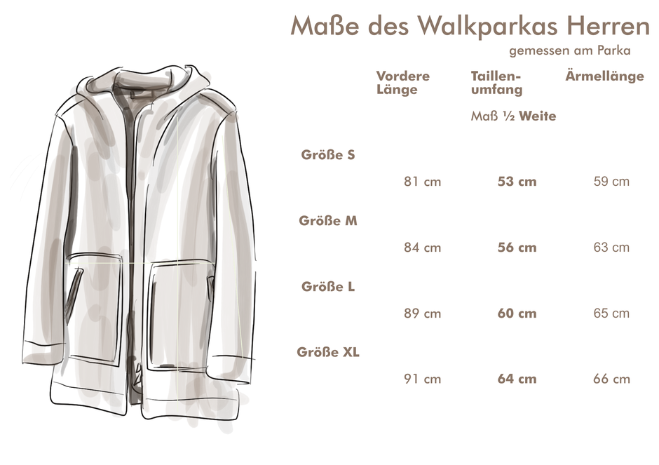 Die Größen S-XXL entsprechen normalen Konfektionsgrößen. Der Mantel ist großzügig geschnitten, damit noch ein dicker Pulli oder eine dünne Jacke darunter passt.